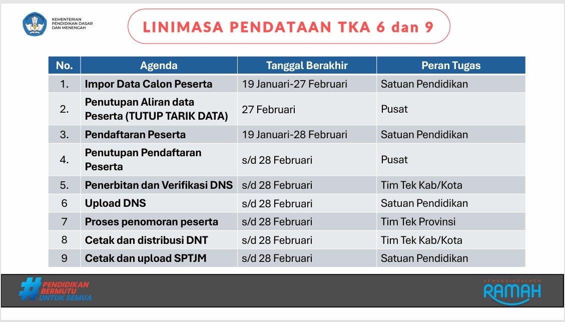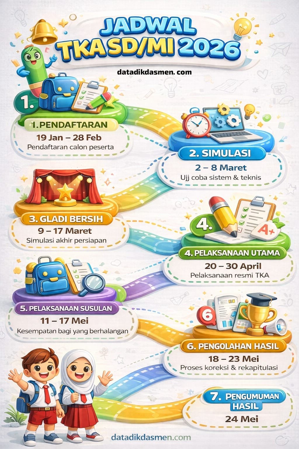 Slide Mekanisme Pendataan TKA – BSKAP Slide Mekanisme Pendataan TKA – Rakor SE TKA Nomor 0191/H.H4/SK.02.02/2026 Infografis Jadwal TKA SD/MI 2026 – datadikdasmen.com Web Login Admin TKA Tanya Jawab Seputar TKA – kemendikdasmen.go.id Pertanyaan yang Sering Diajukan : Navigasi pos Rilis Aplikasi Dapodik versi 2026.b dan Patch 2026.c